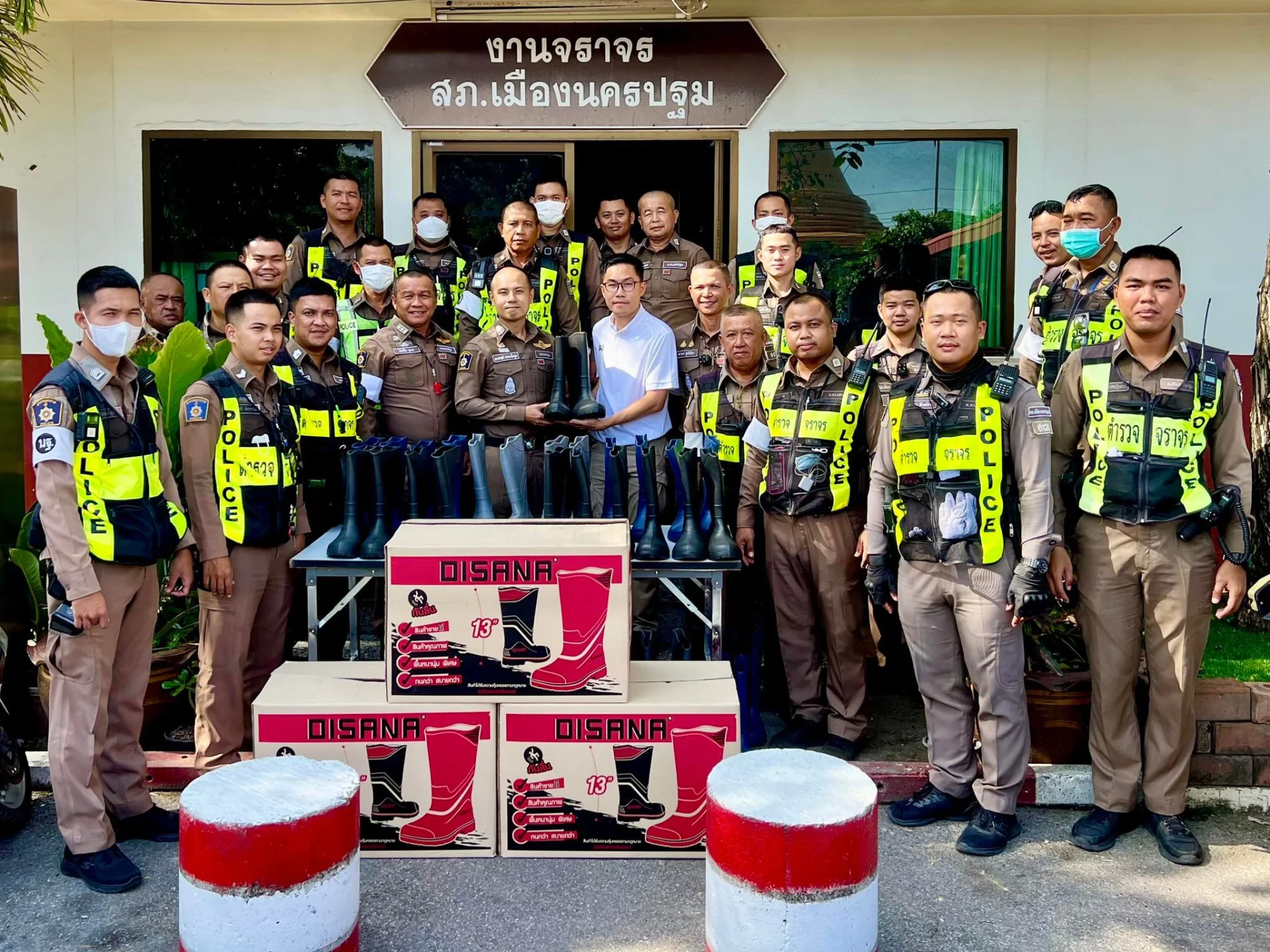 Disana Footwear ได้มีโอกาสร่วมสนับสนุน รองเท้าบูท EVA น้ำหนักเบา ทนทาน และสวมใส่สบาย ให้แก่เจ้าหน้าที่ตำรวจจราจร สถานีตำรวจภูธรเมืองนครปฐม (งานจราจร สภ.เมืองนครปฐม) เพื่อใช้สวมใส่ในการปฏิบัติหน้าที่ในช่วงฤดูฝน